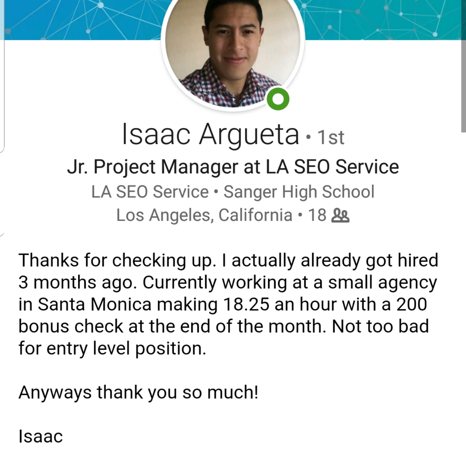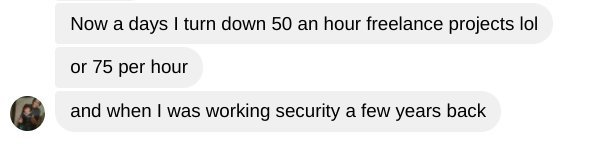 And this is his most recent message to me - between freelance clients & salary he's almost at $100K/Yr.