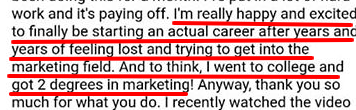 To illustrate this point, take a look at this in depth testimonial from Sue. She had 2 Marketing Degree and was struggling to get into the field before she found the course. I get messages like this all the time from people who have Marketing Degrees or who have taken other more expensive online programs.