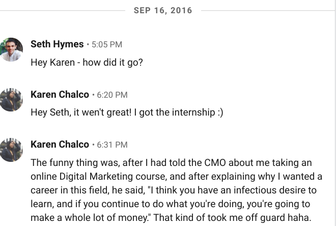 At Age 19, Karen enrolls in my course, follows the instructions, and gets an interview for a Paid Internship...and nails it.