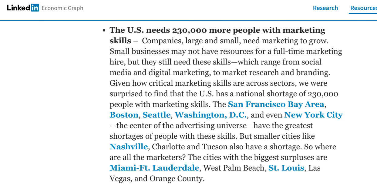 Linkedin Reported That the US Needs 230,000 more Marketers. On top of that there is a major "skills gap" caused by all the nonsense being taught, and not being taught in colleges. Jobs are evolving faster than people are being educated which leaves an enormous opportunity for people who actually get skills employers need.