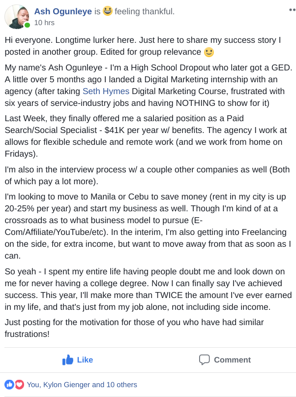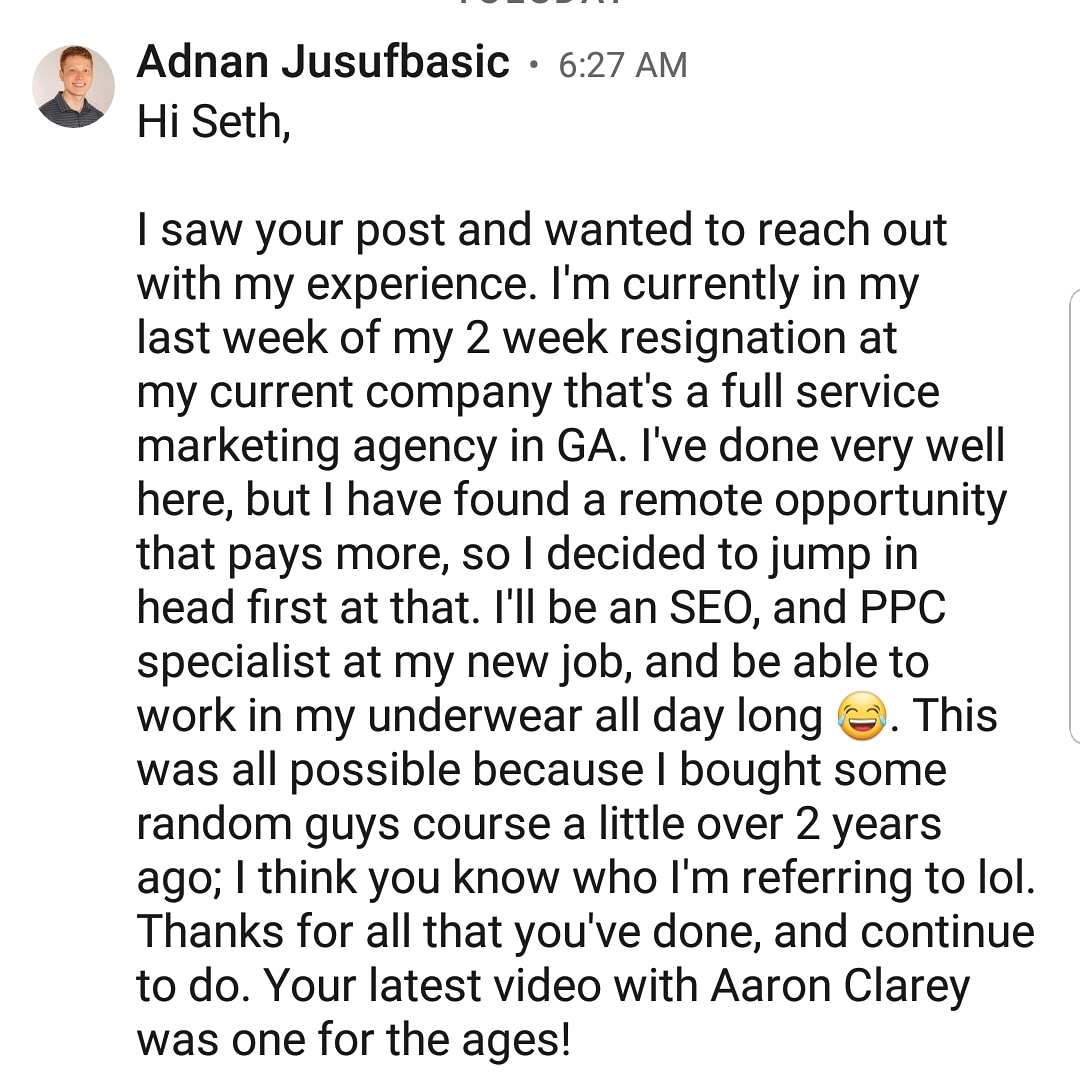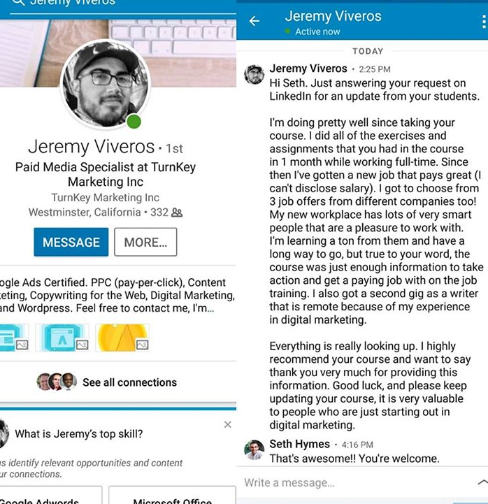 However, if you have no clue about Digital Marketer you still likely won't get the job -- which is why our training is designed to show you EXACTLY what you'd need to get a job like this, and Jeremy is another example of a student with no degree or experience.