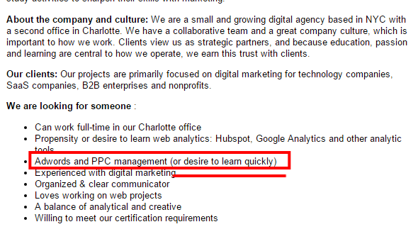 These Companies Are Young and Looking for Passion and Creativity! Just look at the introductory description below. You definitely would need the skills and basic experience we teach here in PPC and SEO, but the Digital Marketing Culture is the laid back fun, tech culture unlike traditional corporate jobs.